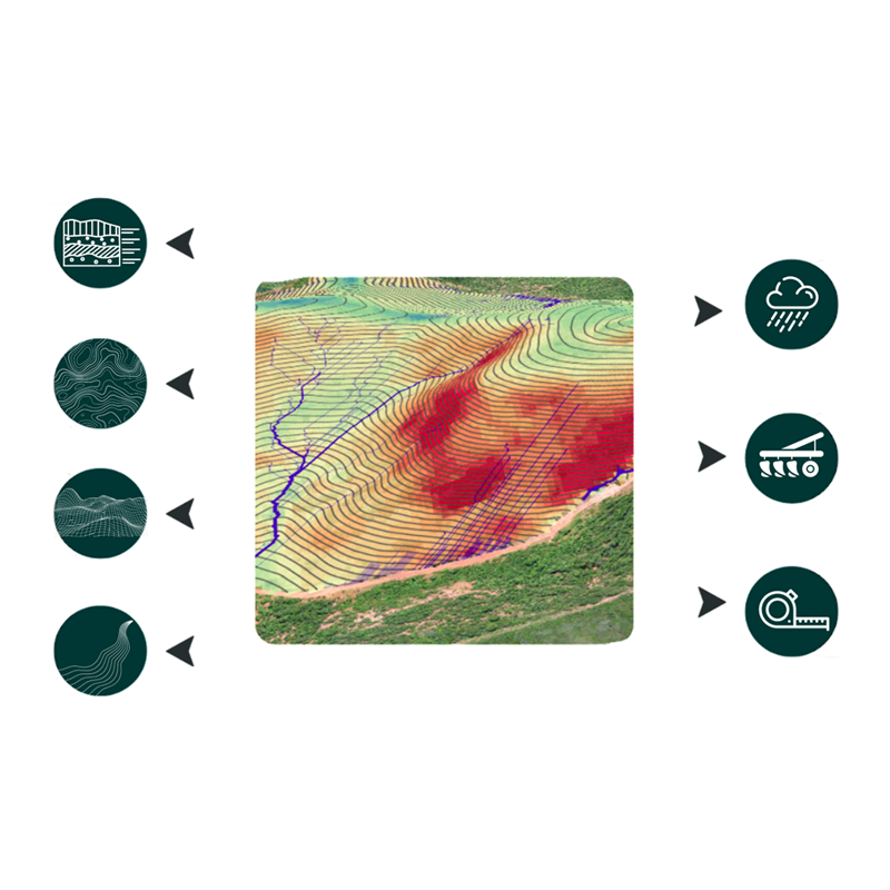 Field Planning incorporates algorithms and methodologies for the automatic generation of project scenarios in the farming context. Our intelligence considers intrinsic terrain characteristics, such as: